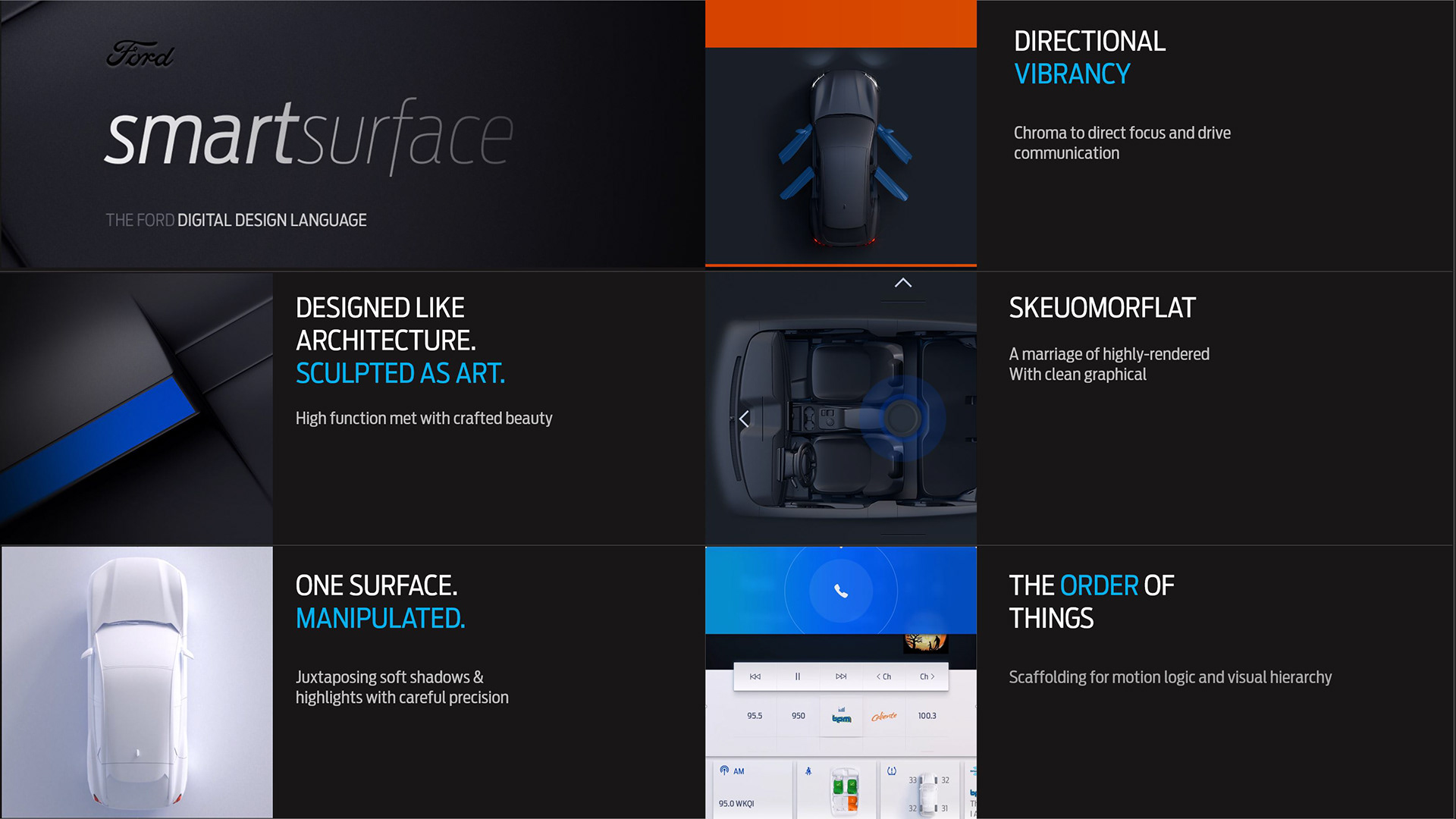 Spearheaded visual DNA definition and execution across all Sync4/4A Ford programs most of which are on the road today. This DNA later cascaded to the web and app. Objectives: 1 - Gain software efficiencies from a scalable system of design. 2 - Ensure global showroom consistency. 3 - Build a stronger connection to the customer and equity in the brand. The original premise was to design a UI that looked and felt human, thus the initial conception had a lot of cues to tactile touches of physical elements. Button states had visual feedback of being "pressed in" to the surface. This became the visual trademark. However, it was important not to create skeuomorphic deign, rather bring together the best of both worlds (flat UI and tactile 3D), and eliminate the excess. Neumorphism, as it's coined now was arguably originated from the designs executions first seen in production on the Mach-E utilizing the "Smart Surface design language".